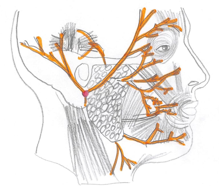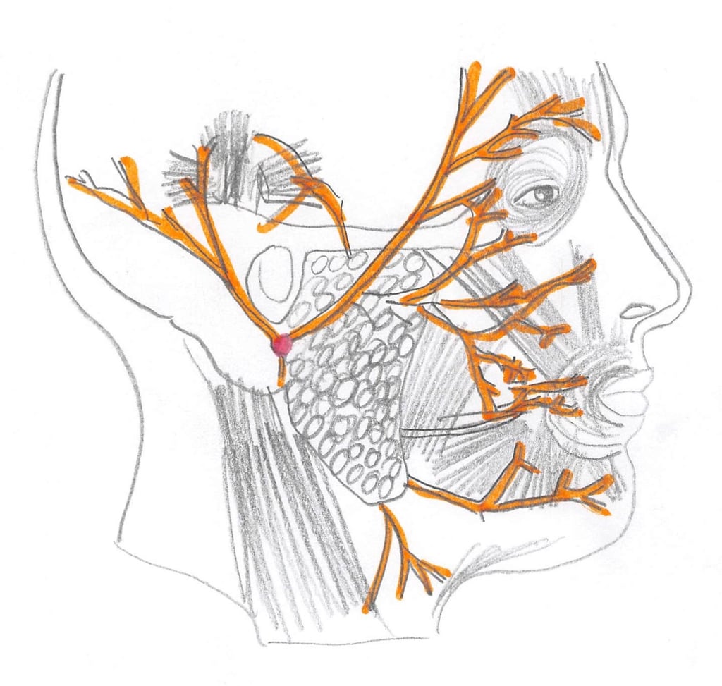 The brainstem is the first of two places where the virus is thought to gather and be stored in its latent stage. Its main nerve travels out of the skull and splits into three smaller nerves at a ganglion (which is like a relay point) just behind the ear. This happens to be at the acupuncture point SanJiao-17. This ganglion is thought to be a second place where the virus can gather and go latent. The three branches then innervate the side of the face and reach the muscles around the eye, nose, and mouth, as well as the tear and salivary glands, and back of the tongue.