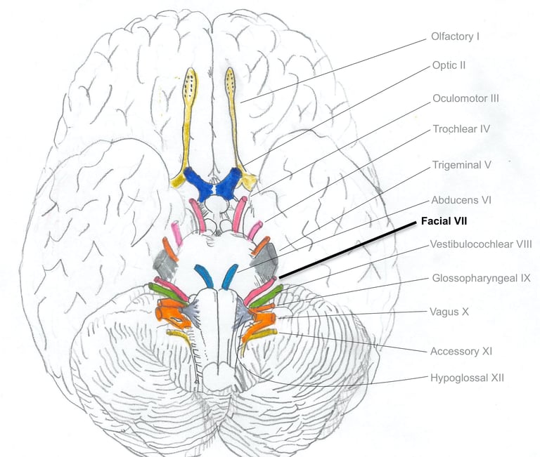 Temporary facial paralysis on one side of the face is caused by impairment of the Facial Nerve. This is the seventh cranial nerve. It originates inside the skull, on the underside of the brain, like the other cranial nerves. This area is called the brainstem, it's between the brain and spinal cord. Thus, it's in the back of skull and on the bottom of the skull, and is part of the Central Nervous System.